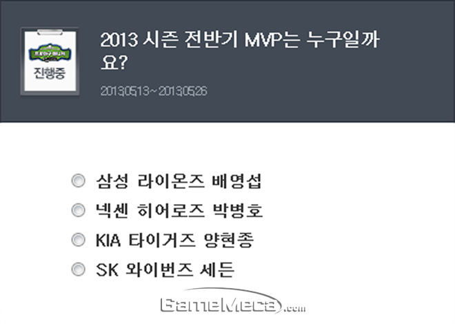 'ÇÁ·Î¾ß±¸ ¸Å´ÏÀú' ´Â ÀÌ¿ëÀÚµéÀ» ´ë»óÀ¸·Î ¾ß±¸¿Í °ü·ÃµÈ ´Ù¾çÇÑ ÁÖÁ¦¸¦ ¼±Á¤ÇØ ¸Å¿ù ȨÆäÀÌÁö¸¦ ÅëÇØ ¼³¹®Á¶»ç¸¦ ½Ç½ÃÇÑ´Ù. ù Áú¹®Àº '2013 ÇÁ·Î¾ß±¸ ½ÃÁð Àü¹Ý±â MVP´Â ´©±¸?'·Î ¿À´Â 26ÀϱîÁö ´äº¯À» ¹Þ´Â´Ù.