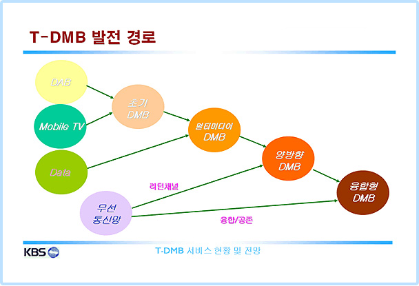 DMB´Â DAB(À¯·´Çü µðÁöÅжóµð¿À ¹æ¼Û ½Ã½ºÅÛ)¿¡¼ ÁøÈÇß´Ù. ±¹³»¿¡¼´Â 1990³â´ë ÈĹݺÎÅÍ DABÀÇ ±¹³»µµÀÔÀ» ³íÀÇÇØ¿À´Ù 2000³â´ë µé¾î DAB¿¡ ºñµð¿À ¼ºñ½º¸¦ Ãß°¡ÇØ DMB·Î ¹ßÀü½ÃŲ °ÍÀÌ´Ù. ¿©±â¿¡ ÇÑ¹ß ´õ ³ª°¡ CDMA³ª ¿ÍÀ̺ê·Î °°Àº ¹«¼±Åë½Å¸ÁÀ» »ç¿ëÇØ ¾ç¹æÇâ ¼ºñ½º¸¦ Á¦°øÇÒ ¼ö ÀÖ°Ô Çß´Ù.