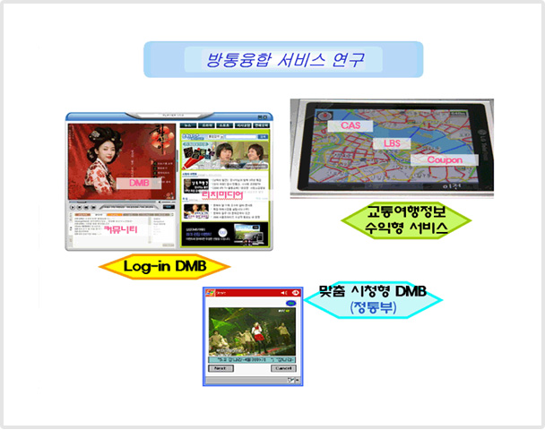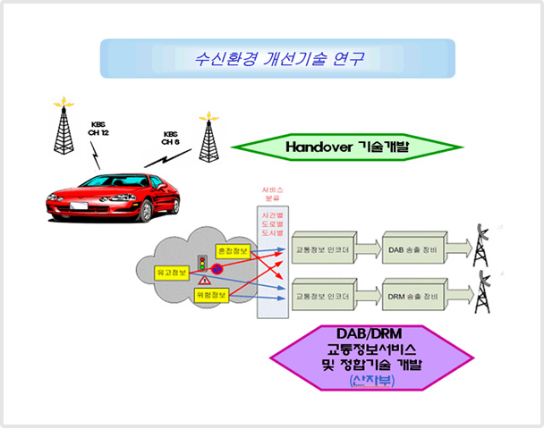 µ¥ÀÌÅÍ ¹æ¼ÛÀ» À§ÇÑ ±¹³»±Ô°Ý Ç¥ÁØÈ¿¡ Âü¿©Çß°í, ¡®KBS MOZEN TPEG' ±³Åë¿©ÇàÁ¤º¸¼ºñ½º¸¦ °³¹ßÇØ ¹æ¼Û¿¡ Àû¿ëÇß´Ù. ¶ÇÇÑ µ¥ÀÌÅÍä³Î ¼ÛÃâ½Ã½ºÅÛ°ú DMB Àü±¹¸Á ±¸ÃàÀ» À§ÇÑ ¡¯DMB ÅëÇÕÃøÁ¤ ¹× ºÐ¼® ½Ã½ºÅÛ¡®À» °³¹ß, Ȱ¿ëÇϰí ÀÖ´Ù. ÇöÀç´Â Åë½Å¸Á°ú ¿¬µ¿ÇØ ¡¯¾ç¹æÇâ ¸®Ä¡¹Ìµð¾î ¼ºñ½º¡¯¿Í DMB Ä¿¹Â´ÏƼ ¼ºñ½º¸¦ Á¦°øÇϱâ À§ÇÑ ¡®Log-in DMB', ½ÃûÀÚ°¡ ¿ä±¸ÇÏ´Â ÇüÅ·ΠÄÜÅÙÃ÷¸¦ Á¦°øÇÏ´Â ¡®¸ÂÃã½ÃûÇü DMB ½Ã½ºÅÛ¡¯, ±×¸®°í ¼ºñ½ºÀÇ ¿¬¼Ó¼ºÀ» À§ÇÑ ¡®Handover ±â¼ú¡¯ µîÀ» °³¹ßÇϰí ÀÖ´Ù.