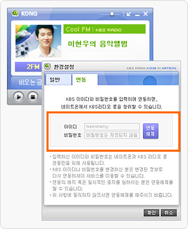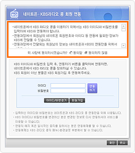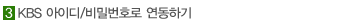 µ¿ÀÇÇÔÀ» ¼±ÅÃÇÑ ÈÄ, KBSÀÇ ¾ÆÀ̵ð¿Í ºñ¹Ð¹øÈ£¸¦ ÀÔ·ÂÇÏ°í ¿¬µ¿Çϱ⠹öưÀ» Ŭ¸¯ÇÏ¸é ¿¬µ¿ÀÌ