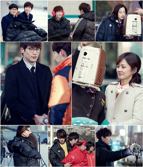 사진 속 배우들은 캔커피, 난로, 담요 등 도구를 이용하거나 서로의 체온을 나누기 위해 꼬옥 껴안는 등 각양각색의 방한법으로 추위에 맞서는 의지를 보이고 있다.