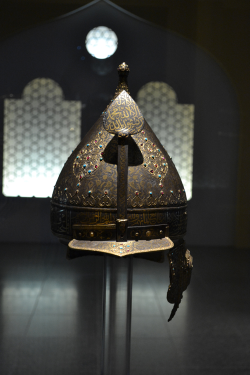 | 오스만 16세기경에 만들어진 보석장식 투구. 터키석과 루비로 장식된 술탄이 사용했던 투구이다. |