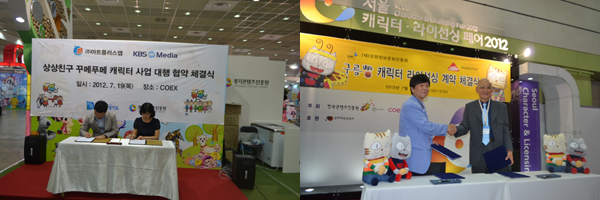 한편 어제 코엑스 현장에서는 다양한 협약식이 체결되었다. KBS미디어는 아트플러스엠과 ‘상상친구 꾸메푸메 캐릭터 사업 대행 협약체결식’을 가졌고, (재)강원정보문화진흥원과 파크스토이는 ‘구름빵 캐릭터 라이선싱 체약체결식’을 갖는 등 토종 캐릭터에 대한 다양한 비즈니스 모델이 구체화되었다.