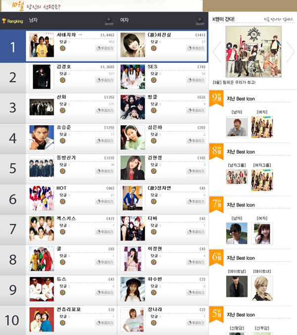 투표결과는 아이돌 역사의 산증인이라고 해도 과언이 아닐 정도로 가요계에 큰 발자취를 남긴 그룹 서태지와 아이들이 1446표로 남자부분 1위로 선정되었으며 수많은 드라마를 통해 대중들을 웃고 웃겼지만 이제는 영원한 안식에 들어간 배우 故 최진실이 141표를 얻어 여자부분 1위를 거머쥐었다.