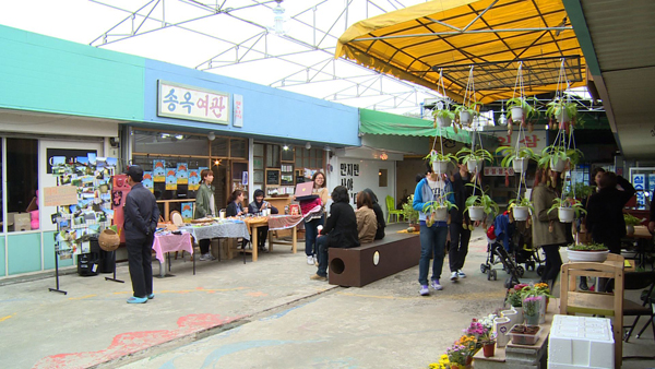 오랫동안 버려지다시피 했던 공간에 자리 잡은 만큼, 사람을 더 끌어 모으기 위해 열심히 홍보하는 청년몰 사장들. 가게는 잠시 닫아두고 홍보전에 더 열심히 임할 때도 있다. 기타 교습소 사장 최정엽씨는 1층 가게들 앞에서 전통시장과는 조금 어울리지 않는 포크 음악 공연을 한다. 영업중에 갑작스럽게 설치된 커다란 스피커와 각종 장비들, 번거롭고 시끄럽진 않을까? 하지만 오히려 공연을 더 잘 할 수 있도록 박수쳐주고, 가게를 정리해주는 전통시장 상인들.