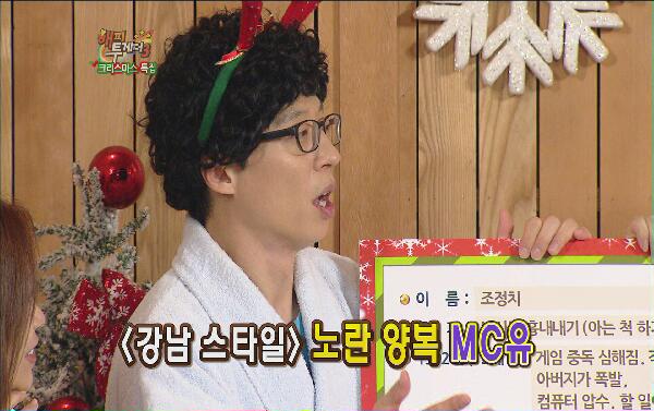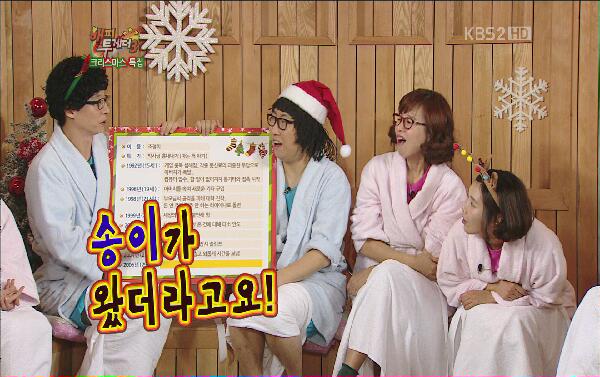 이에 MC 박명수는 싸이의 메가 히트곡 <강남 스타일> 뮤직비디오에 출연한 유재석에게 시선을 돌리며 어떤 선물을 받았느냐고 캐물었다. 그러자 유재석은 "뭘 받고 싶느냐고해서 괜찮다고 했는데 뮤직비디오를 찍은 다음 날 송이가 왔더라."며 선물을 받은 사실을 공개했다.
