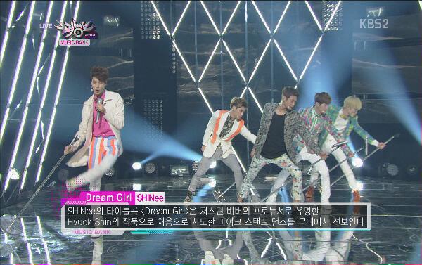 2월 넷째 주 뮤직뱅크(689회)가 어제 오후 서울 여의도 KBS신관 스튜디오(TS-15)에서 아이돌 스타 샤이니(온유, 종현, Key, 민호, 태민)가 컴백 무대를 가졌다. 이날 샤이니는 '아름다워'와 '드림 걸(Dream Girl)' 두 곡을 불렀다. '드림걸'은 일렉트로닉 비트에 밴드 사운드를 도입한 이색 곡이다. 이날 샤이니는 마이크 스탠드를 활용한 화려한 퍼포먼스를 선사했다.