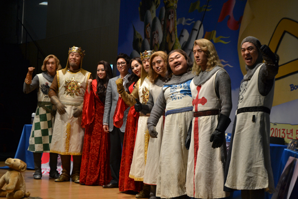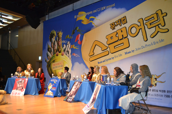 어제 광화문 올레스퀘어에서는 2013년판 뮤지컬 ‘스팸어랏’의 제작발표회가 열렸다. ‘스팸어랏’은 영국 사람이면 다 아는 ‘아더 왕과 원탁의 기사’ 이야기를 다루고 있다. 물론 패러디이다. 이번 뮤지컬에서 아더 왕은 ‘무한도전’의 정준하와 뮤지컬배우 서영주가 더블 캐스팅 되었다. 어제 진행된 ’스팸어랏‘ 제작발표회는 ‘뮤지컬 스팸어랏’처럼 (파이톤풍?) 어처구니없고, 황당하고, 기자들에게는 낯선 방식으로 진행되었다. 제작사 오디뮤지컬컴퍼니의 신춘수 대표가 패널을 맡고 두 명의 아더왕과 나머지 출연배우들이 각기 팀을 이뤄 <60분 토론>방식으로 진행되었다. 게다가 지난 대선토론회처럼 각 후보들은 저마다 멋진 공약과 황당한 약속을 내걸며 ‘스팸어랏’을 홍보하였다.