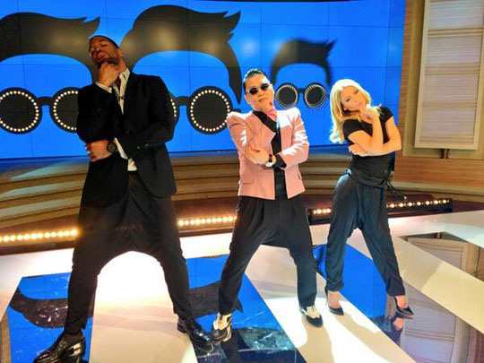 공개된 사진에는 싸이가 미국 ABC 방송국의 간판 프로그램인 <라이브 위드 켈리 앤 마이클>의 진행자인 켈리 리파와 마크 콘슈로스를 사이에 두고 '젠틀맨'의 댄스인 시건방 춤을 추고 있는 모습이 담겨있어 보는 이들의 눈길을 끌고 있다.