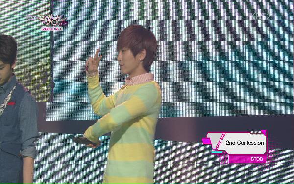 아이돌 그룹 비투비(BTOB;서은광, 이민혁, 이창섭, 임현식, 프니엘, 정일훈, 육성재)가 지난 주 열린 뮤직뱅크에서 '두 번째 고백'을 부르고 있다.