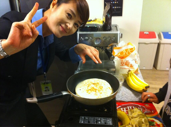지난 5일 KBS 2TV 월화드라마 ‘직장의 신’(극본 윤난중, 연출 전창근 노상훈, 제작 KBS 미디어/MI Inc.)의 촬영현장. 미스김으로 열연중인 김혜수는 이날 토르티야를 무려 100여 인분이나 즉석에서 만들어 동료배우와 현장 스태프들에 간식으로 제공했다. 당초 매니저와 스타일리스트 등 소속사 식구들과 조촐히 먹으려던 간식이었지만 스태프들과 하나 둘 나누다보니 판이 커진 것. 현장 관계자는 “촬영시간을 제외하곤 거의 하루 종일 토르티야만 만들었다”고 전했다. 재료는 토르티야와 바나나, 치즈가 전부였지만 그 맛이 일품이었다는 후문.