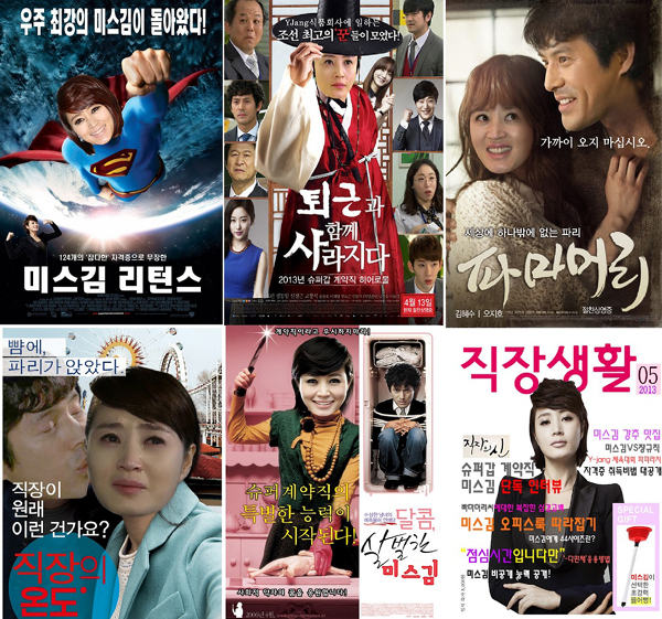 영화 '남자사용설명서' 포스터를 패러디한 '미스김사용설명서'에는 '성공률 100% 칼퇴 비결', '슈퍼 계약직 미스김이 궁금해?' '닥본사' 등의 재치 있는 문구가 눈길을 끈다. '수퍼맨 리턴즈'를 패러디한 '124개의 잡다한 자격증으로 무장한, 미스김 리턴스, 우주 최강의 미스김이 돌아왔다,' '범죄와의 전쟁' 패러디 '계약직과의 전쟁, 내 라인은 내가 지킨다, 장규직 전성시대' 등 대부분의 패러디물이 제작한 이들의 유머와 센스가 돋보이는 '작품'들이다.